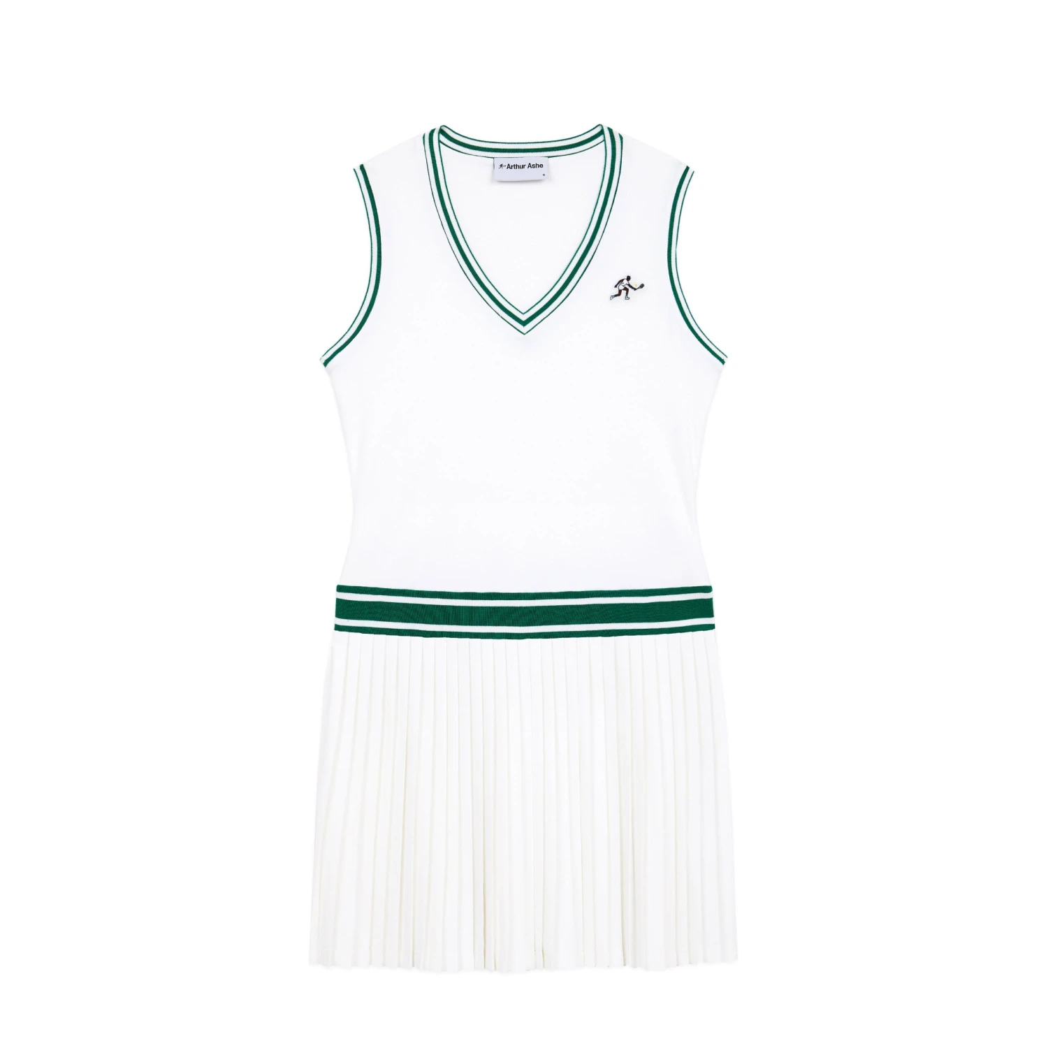 Women’s tennis dress featuring a pleated skirt, ribbed waistband and sleeve openings, and an embroidered Arthur Ashe icon on the left chest.