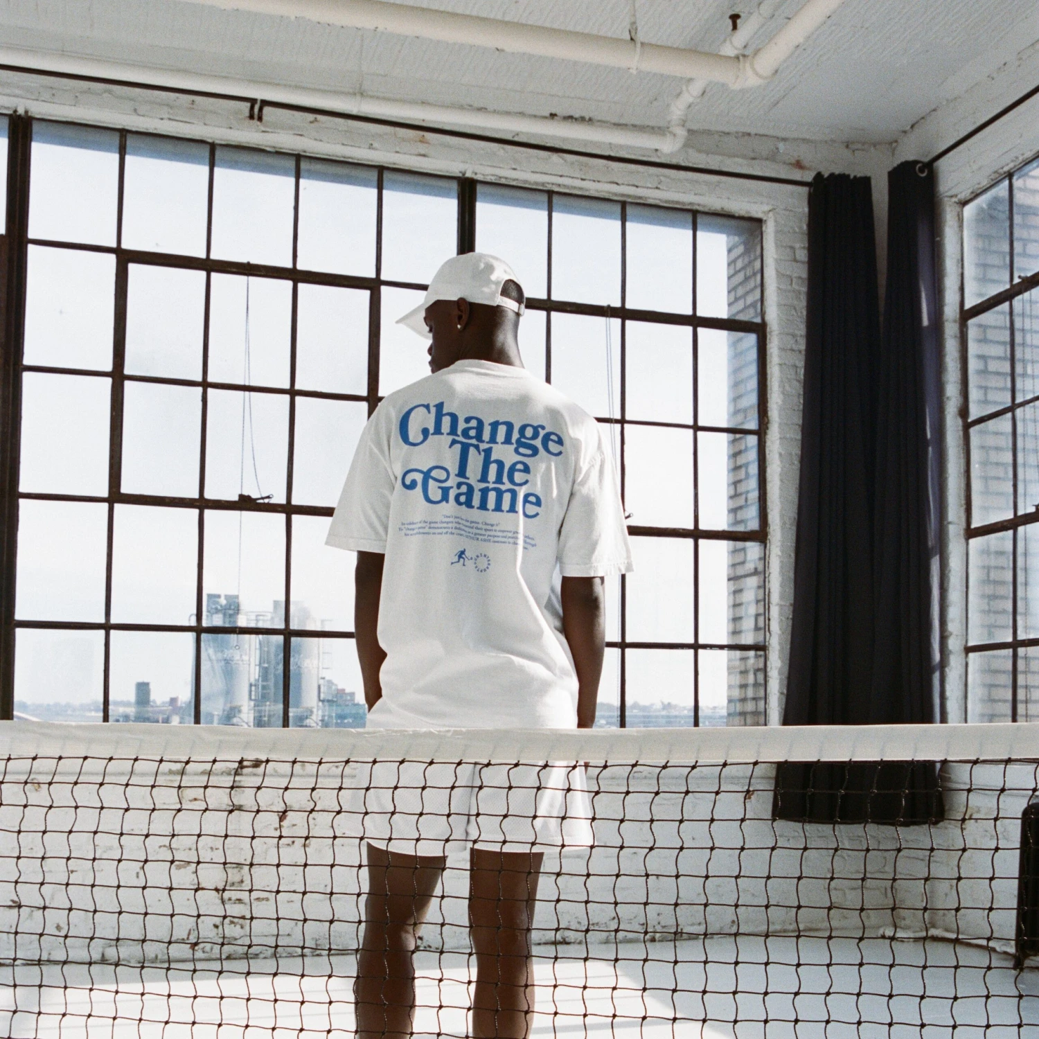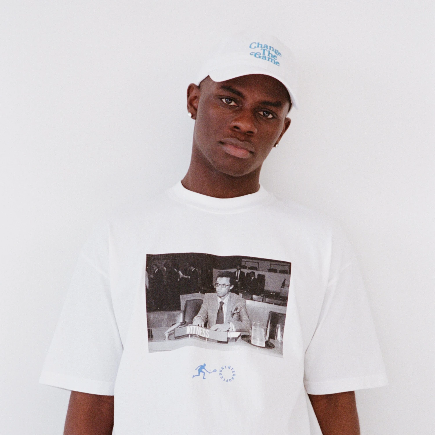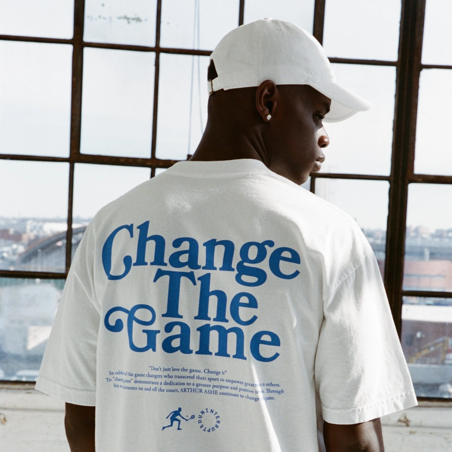 Arthur Ashe x UNINTERRUPTED t-shirt featuring co-branded detailing and an original “Change the Game” motif inspired by a quote of Ashe’s.