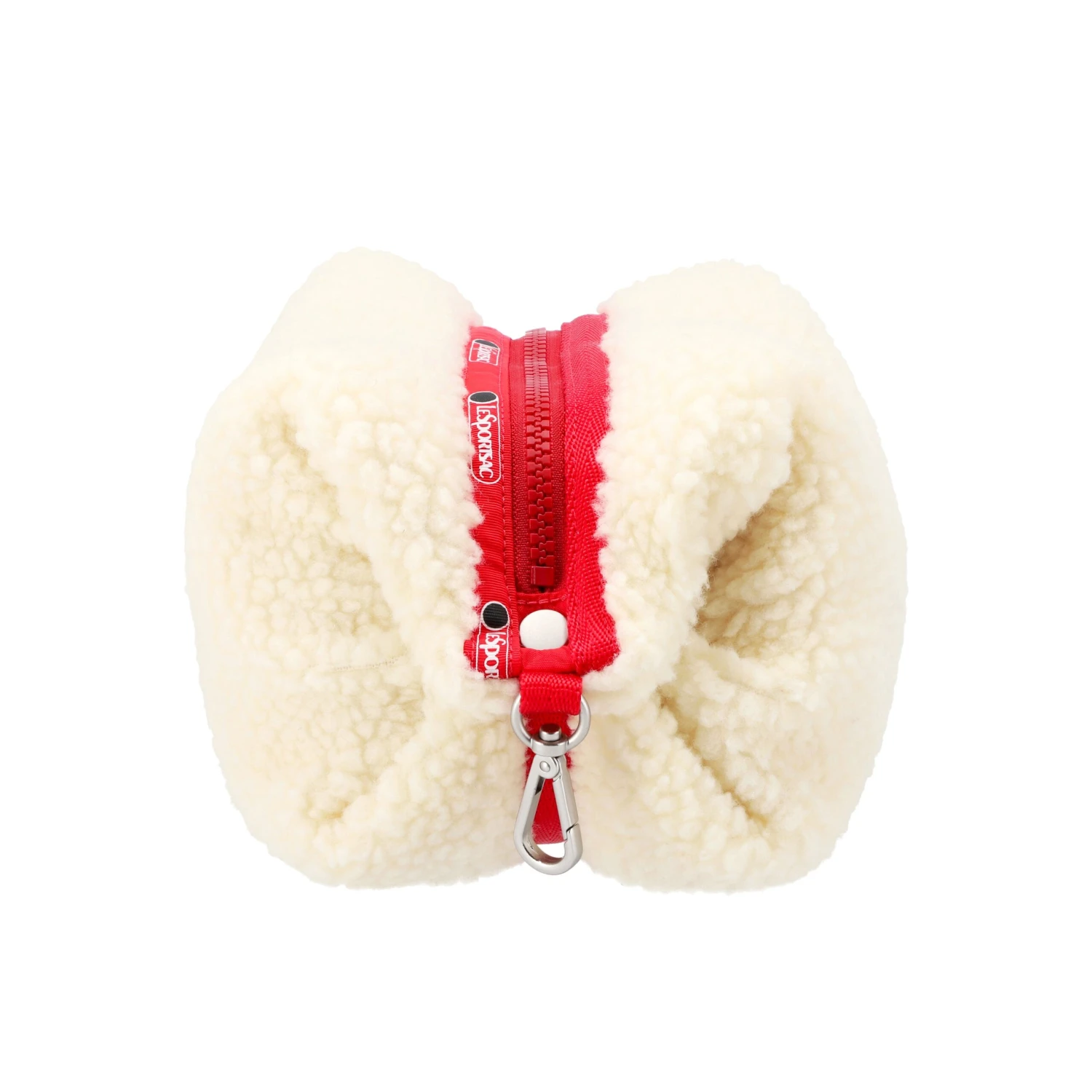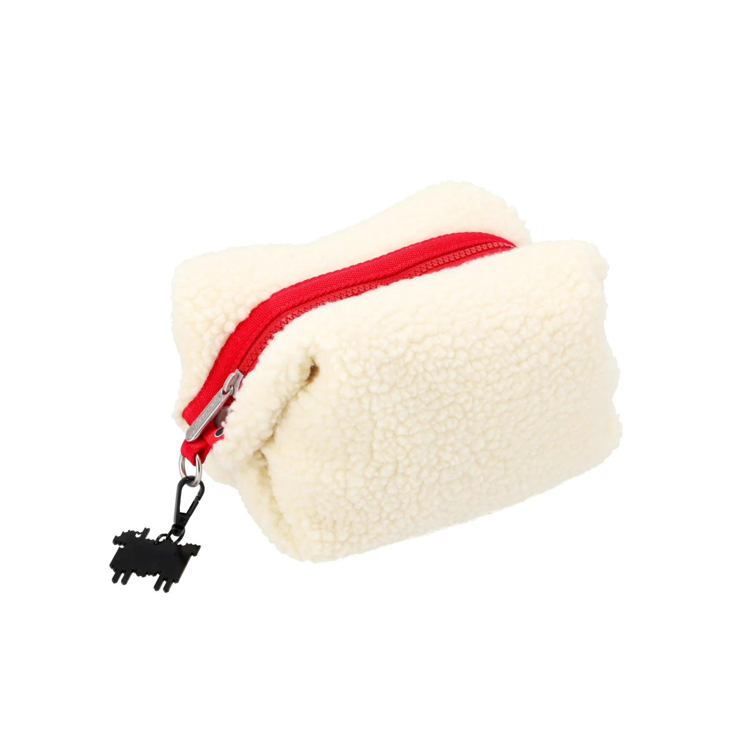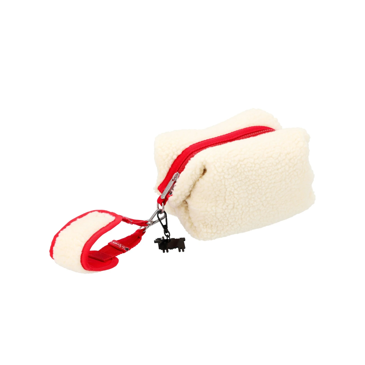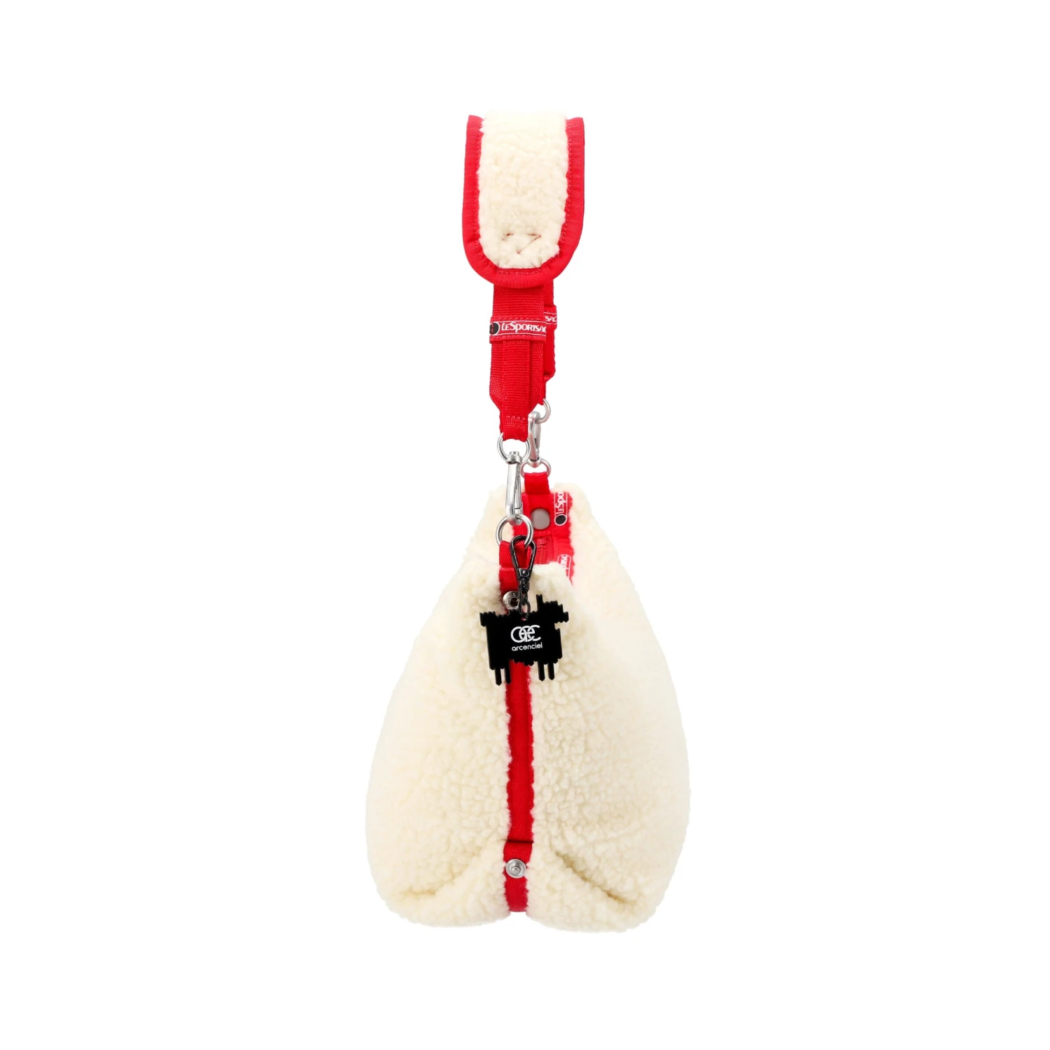 Zippered main closure. Detachable strap with vegan fleece pad. Exterior side snaps to adjust shape of bag. Two interior back wall open mesh pockets. Two interior front wall open pockets. Includes a detachable black metal sheep charm.