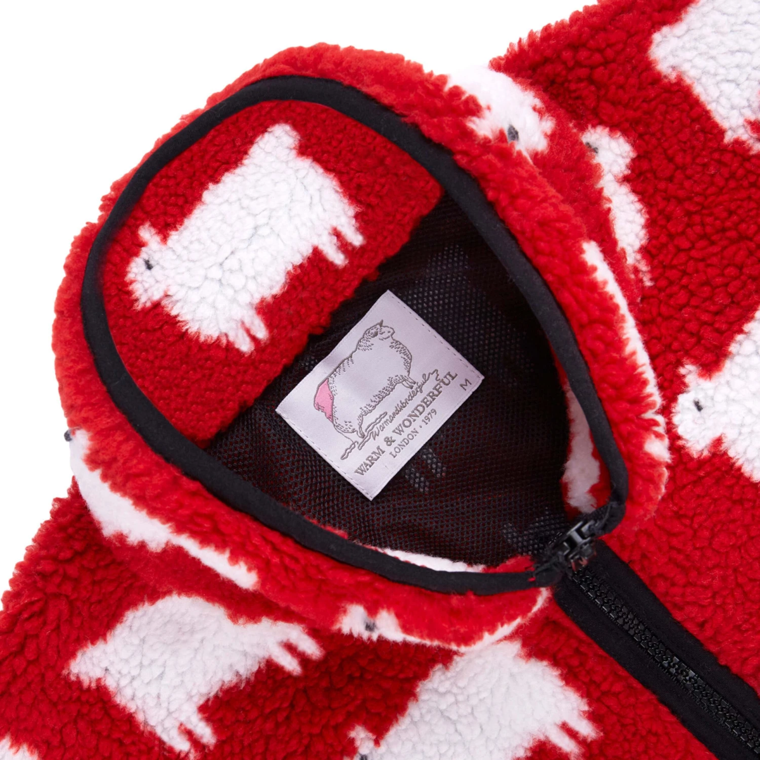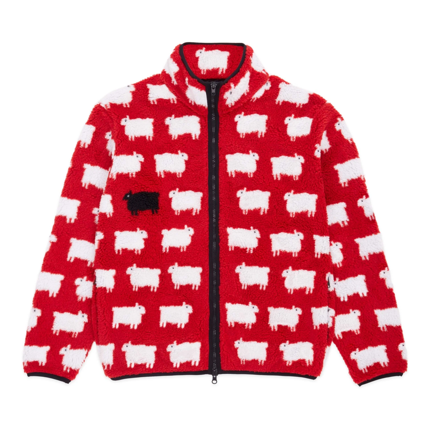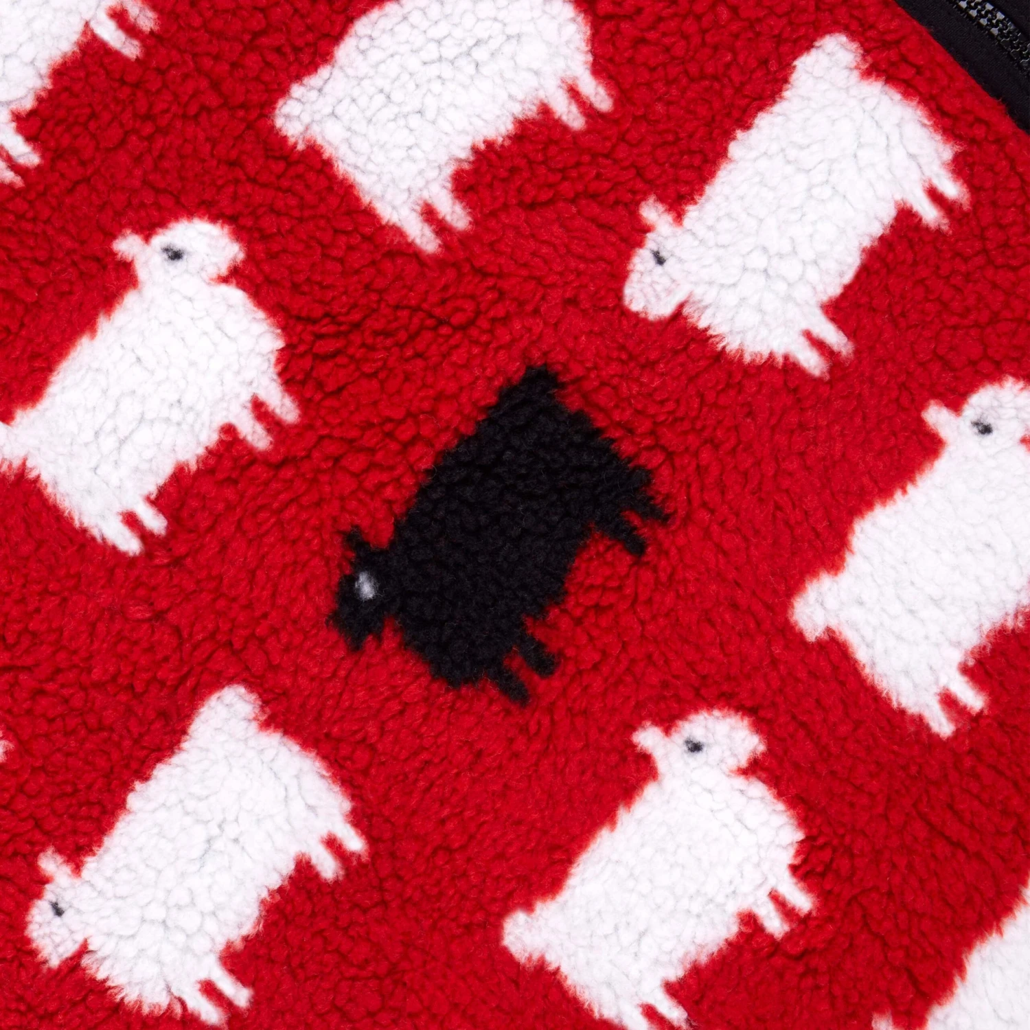 Deep-pile sherpa fleece featuring a full-length tactical Vislon zipper, mesh lining, and Warm & Wonderful’s iconic “Black Sheep” pattern.
