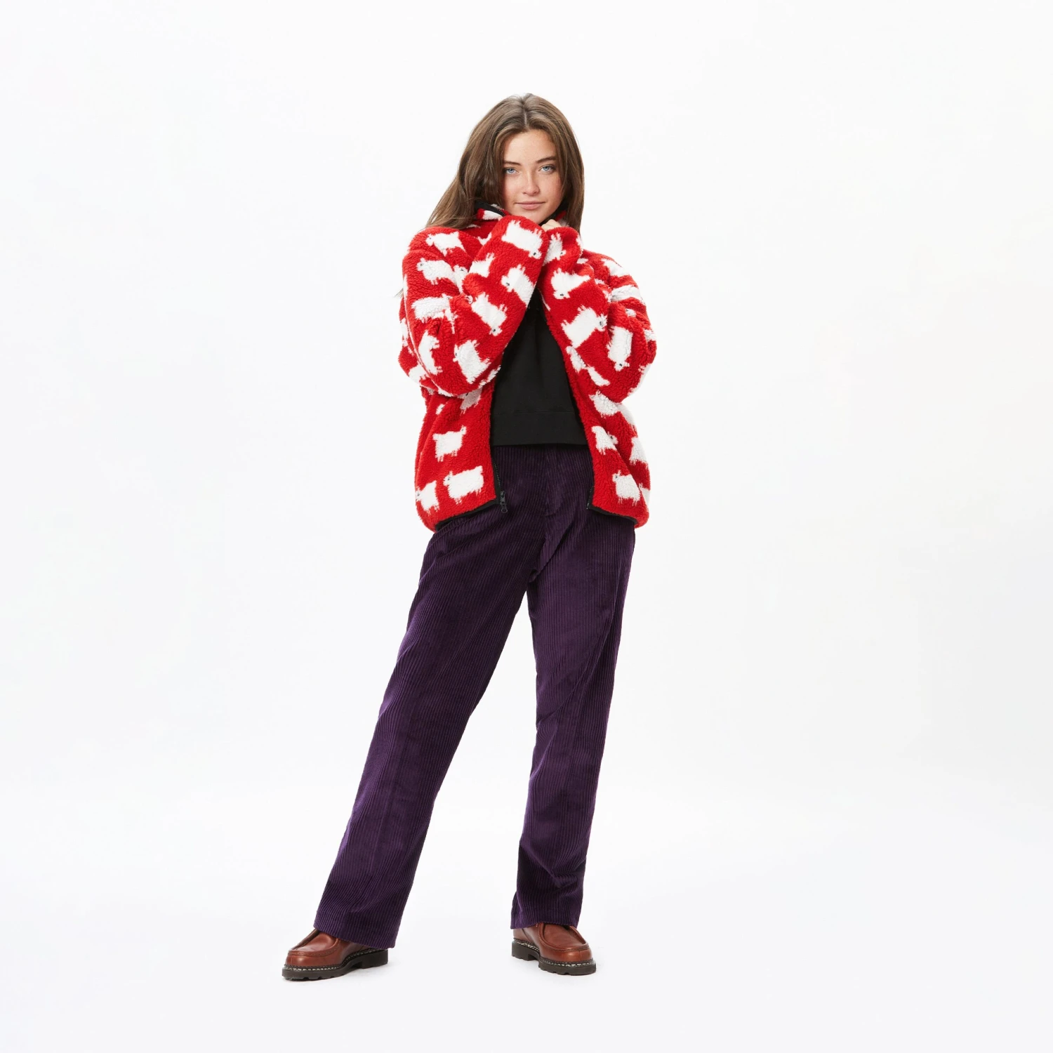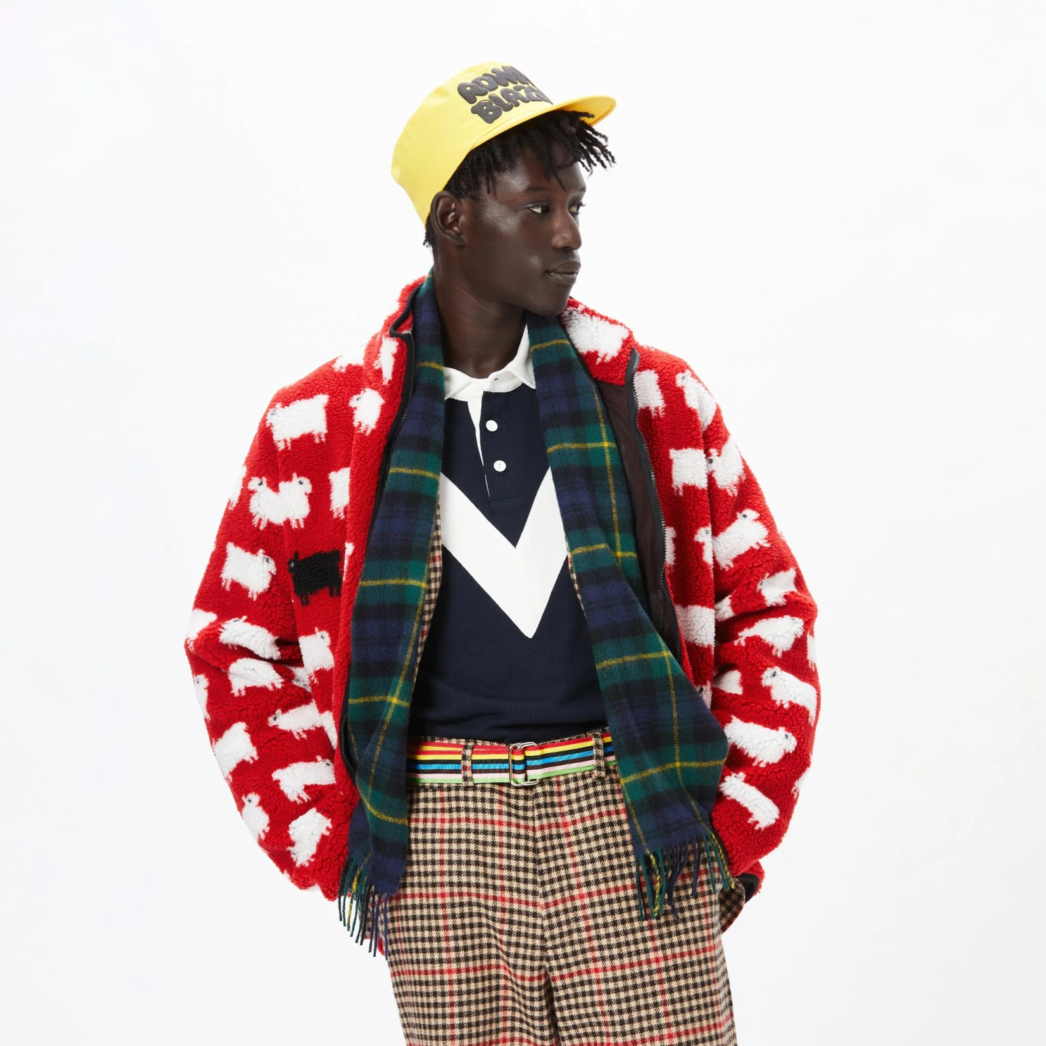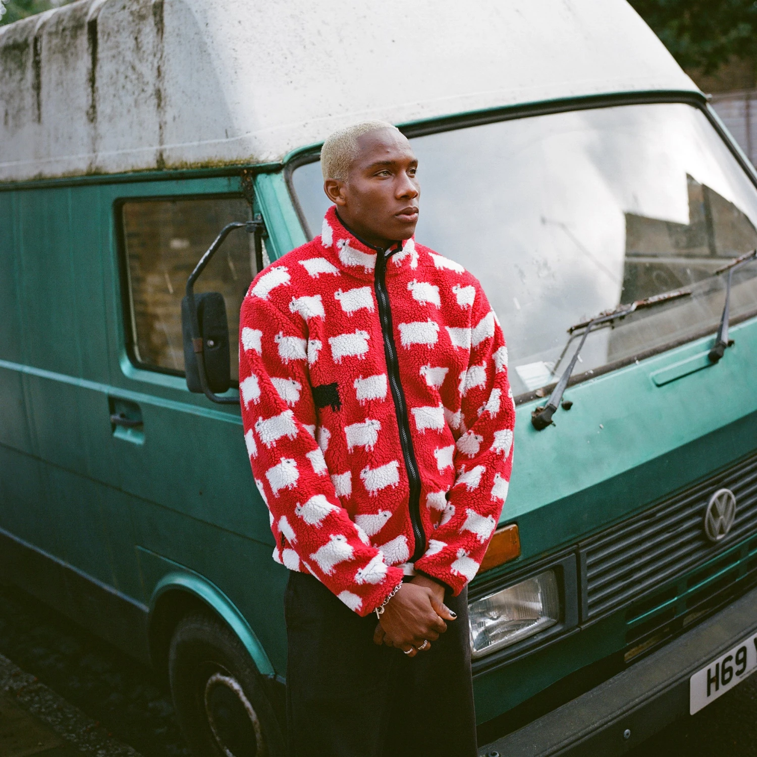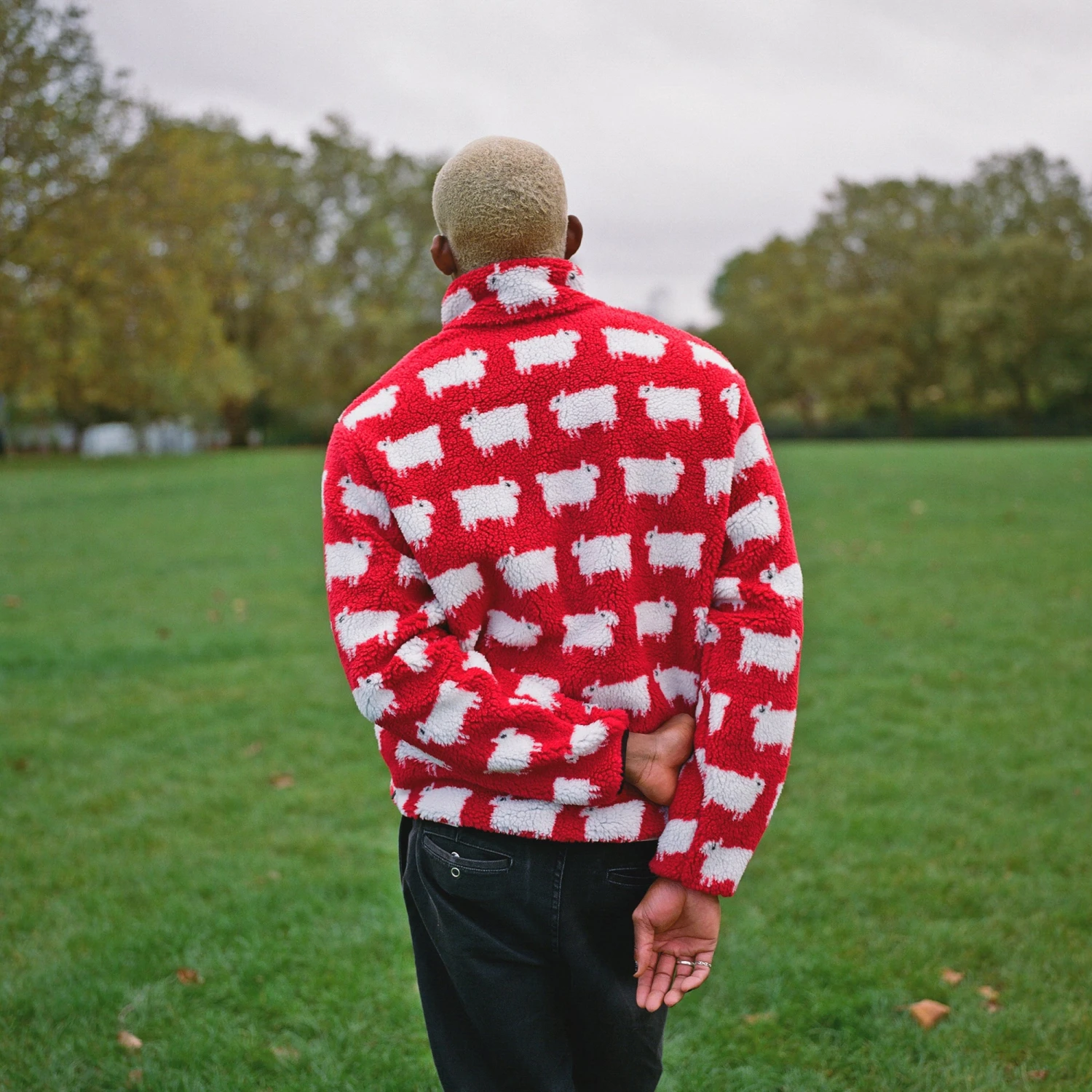 Deep-pile sherpa fleece featuring a full-length tactical Vislon zipper, mesh lining, and Warm & Wonderful’s iconic “Black Sheep” pattern.