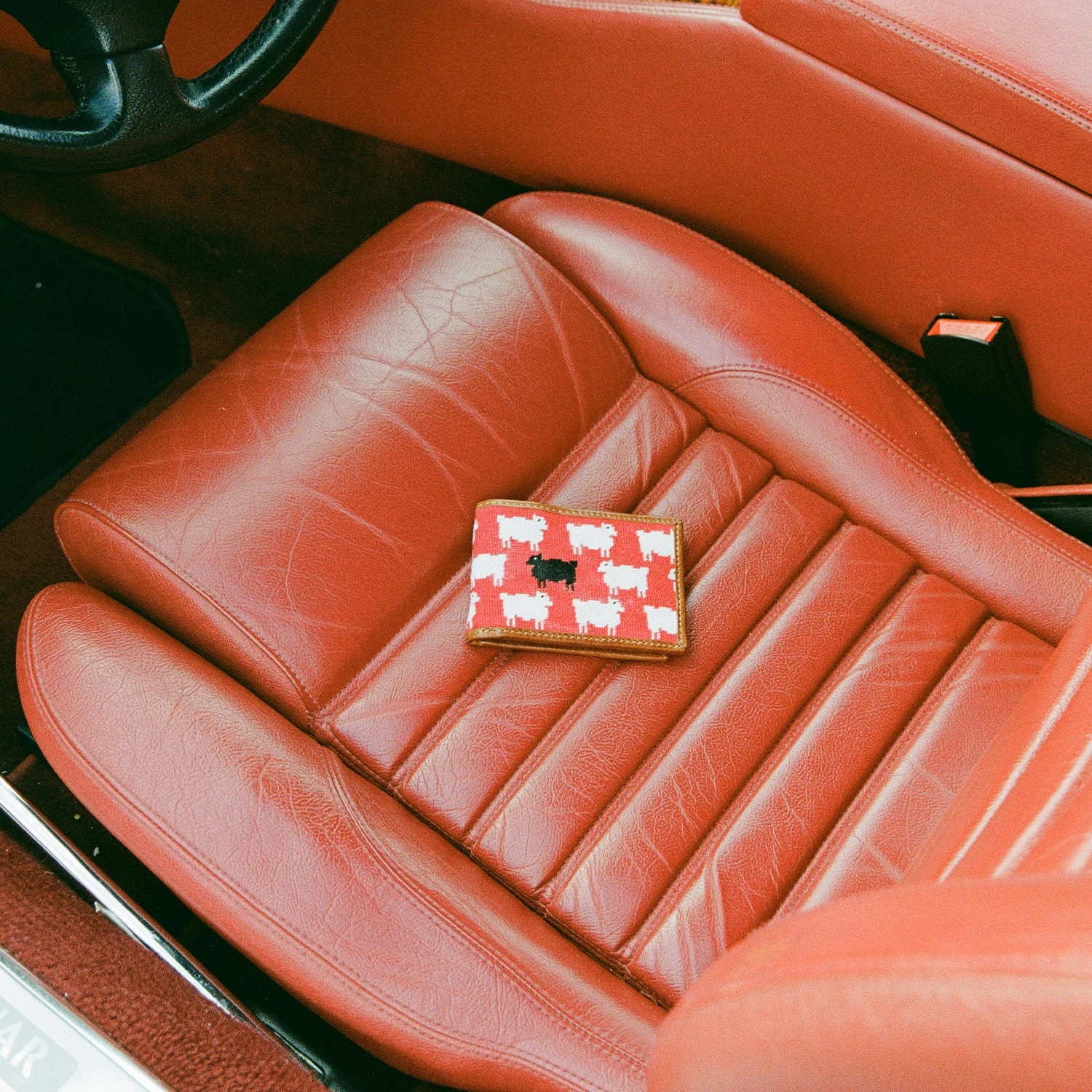 Hand-stitched bi-fold wallet featuring the iconic sheep pattern.